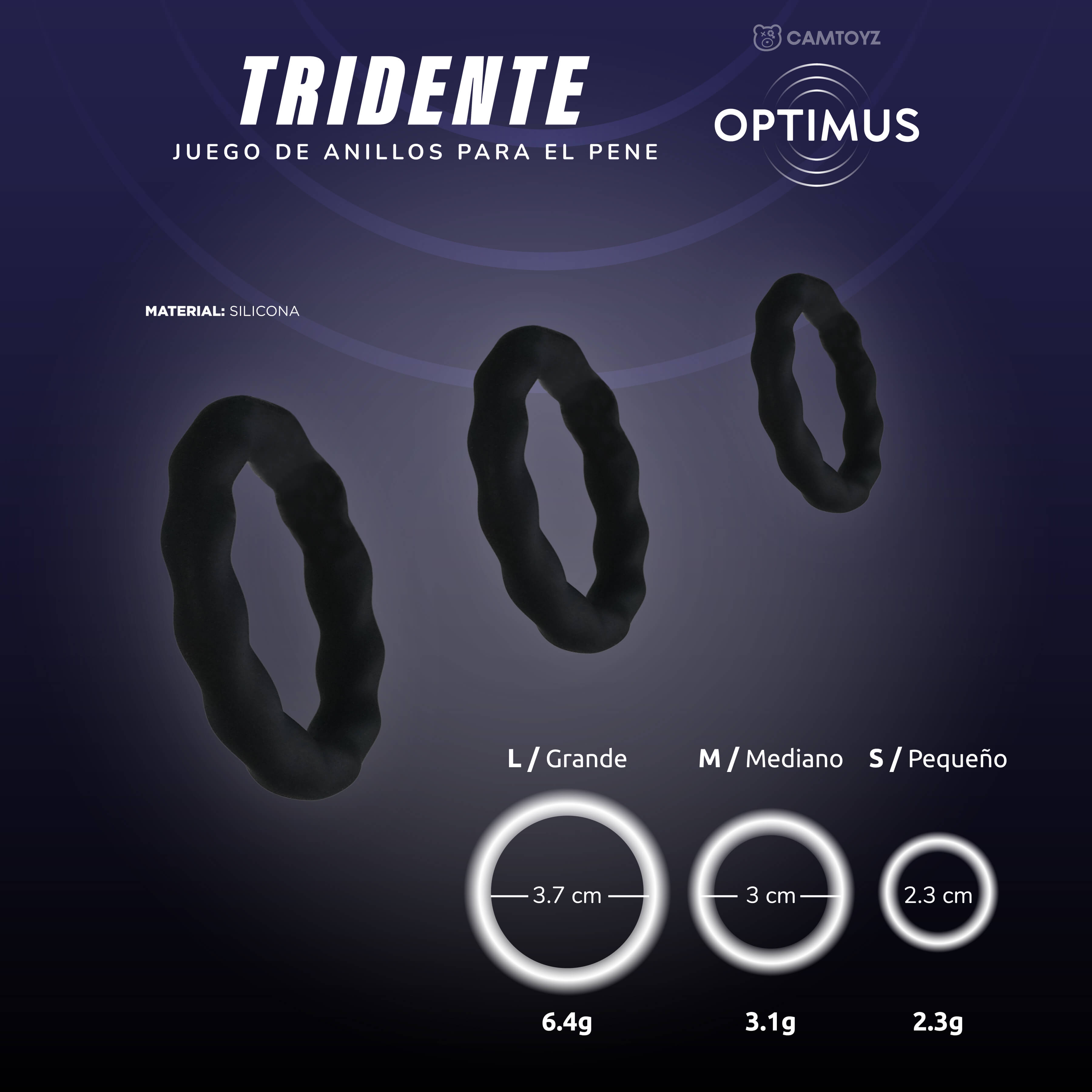Mejora tus encuentros íntimos con los Anillos para el Pene Tridente, un set de 3 anillos de diferentes tamaños diseñados para adaptarse a tus necesidades. De la línea Optimus de Camtoyz, estos anillos ofrecen firmeza y control, ayudando a prolongar la duración de tus relaciones y a intensificar tus sensaciones.
